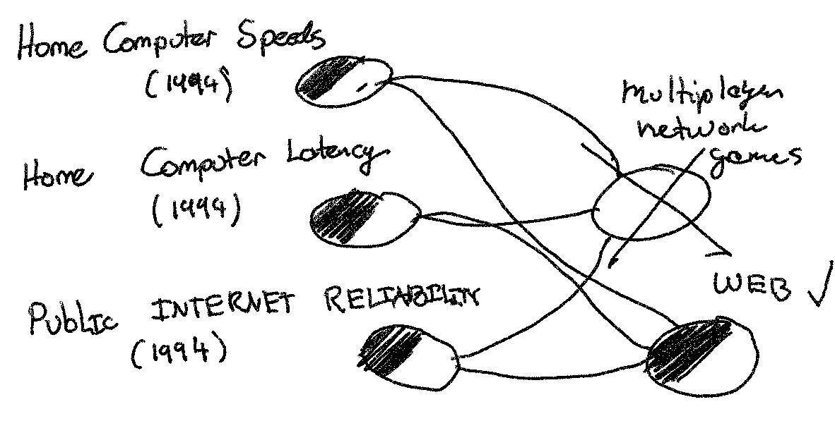 For example, residential internet was not geared yet for responsive online games in the early 90s. It was too early, even if game developers knew it was eventually going to be a thing. It was in the remote possible, but not the adjacent possible. Not enough pre-requisite doors had been opened: home internet speed weren’t good enough, research on how to deal with network latency was poor, and setting up servers all around the world to minimize latency was a lot of work. Being too early means confusing the adjacent and remote possible.