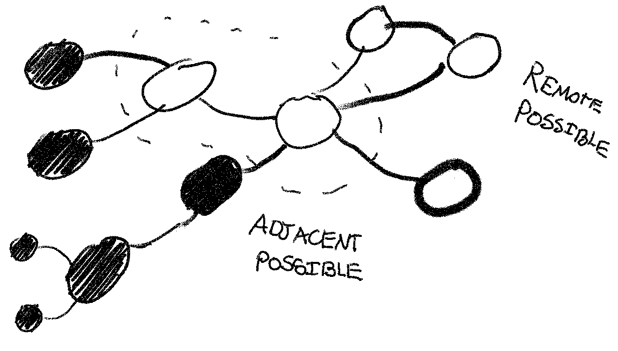 In human culture, we like to think of breakthrough ideas as sudden accelerations on the timeline, where a genius jumps ahead fifty years and invents something that normal minds, trapped in the present moment, couldn’t possibly have come up with. But the truth is that technological (and scientific) advances rarely break out of the adjacent possible; the history of cultural progress is, almost without exception, a story of one door leading to another door, exploring the palace one room at a time. – Steven Johnson, Where Good Ideas Come From