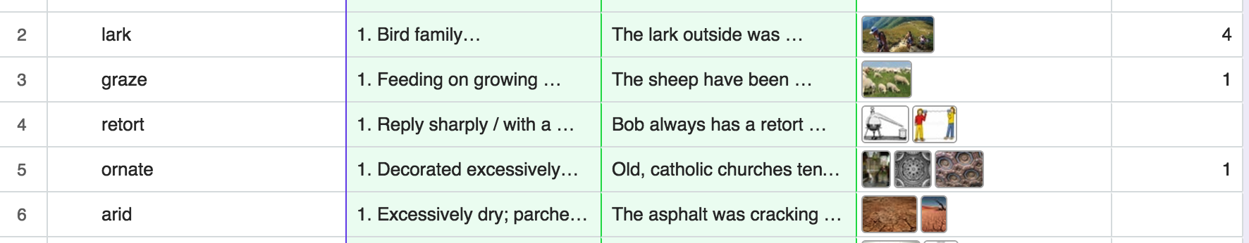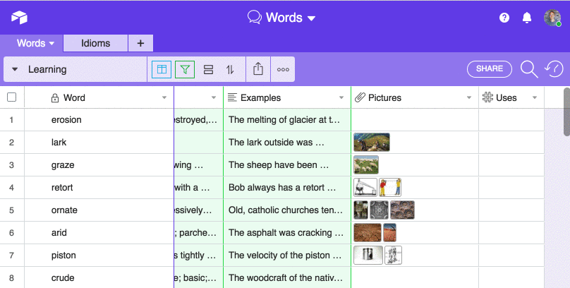 Once in a while (when my Chrome extension tells me to) I’ll go and learn some of these words, write example sentences, add images and definitions.