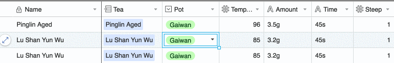 This serves as a starting point with price, type, picture and vendor. If you click on each record, you’ll see more details. This Base started as just a table of all my teas and my rating of them. Later, following Gall’s law, I introduced the complexity of periodically recording brews of teas: