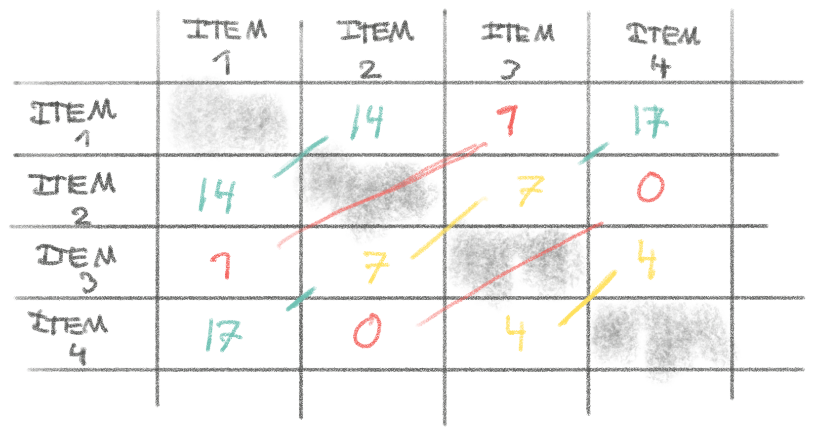 The output of this algorithm would be something like the matrix below. Each cell is the count of customers that bought both items. For example, 17 people bought both item 4 and item 1, which in comparison to others means that it might be a great idea to show people buying item 4 to consider item 1, or vice-versa!