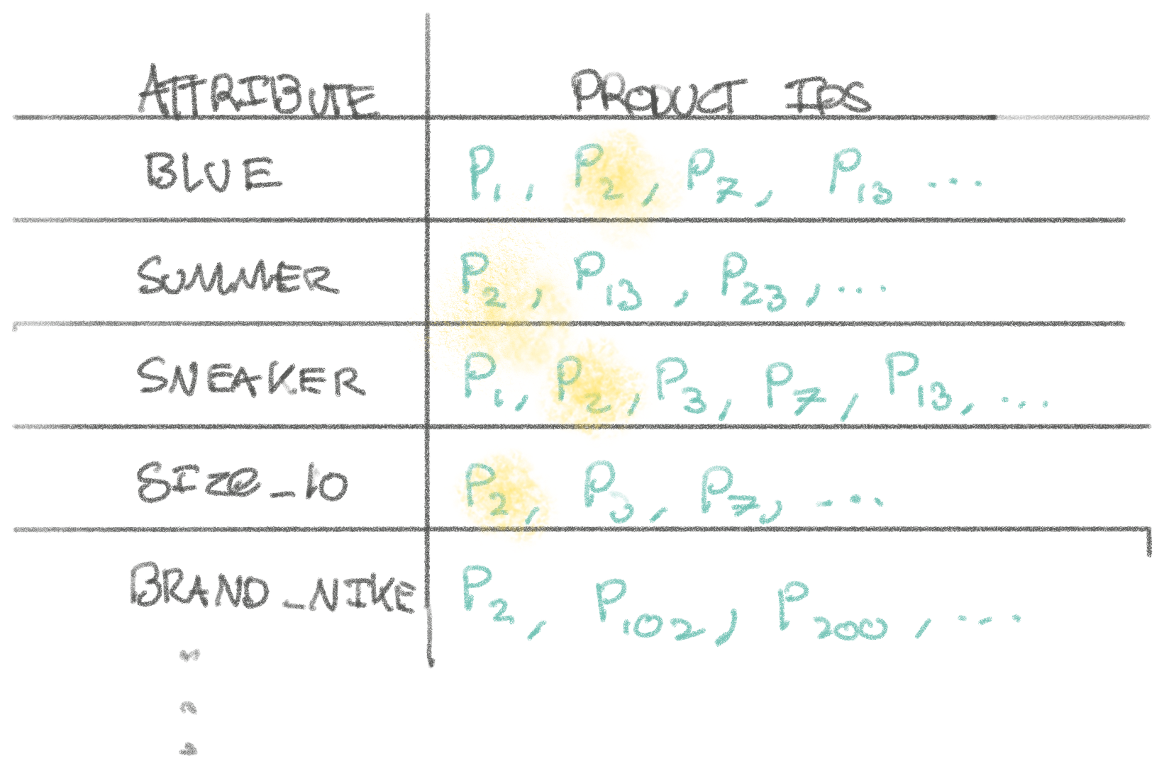 In our inverted index, each attribute (color, type, activity, ..) maps to a list of product ids that have that attribute. We can create a filter for blue, summer, and sneakers by finding the intersection of product ids that match blue, summer, and sneakers (ids that are present for all terms).