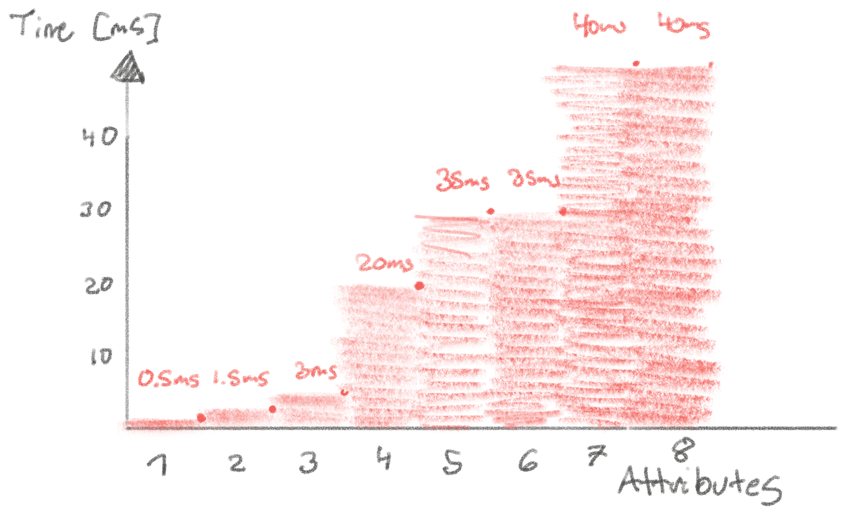 Now, does this scale linearly? Including more attributes will mean scanning more memory. E.g. 8 attributes we’d expect to scan ~10mb * 8 = 80mb of memory, which should take ~0.1ms * 80 = 8ms. However, in reality this takes 30-60ms. This approaches our napkin math being an order of magnitude off. Most likely this is when we have exhausted the CPU L3 cache, and have to cycle more into main memory. We hit a similar boundary from 3 to 4 attributes. It might also suggest there’s room for optimization in Lucene.