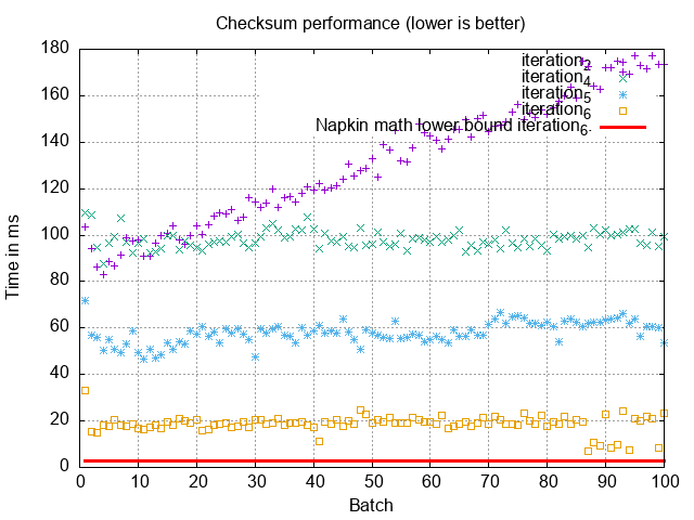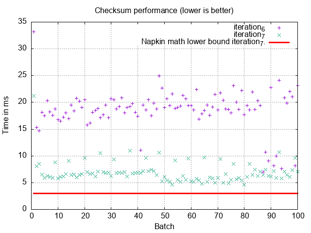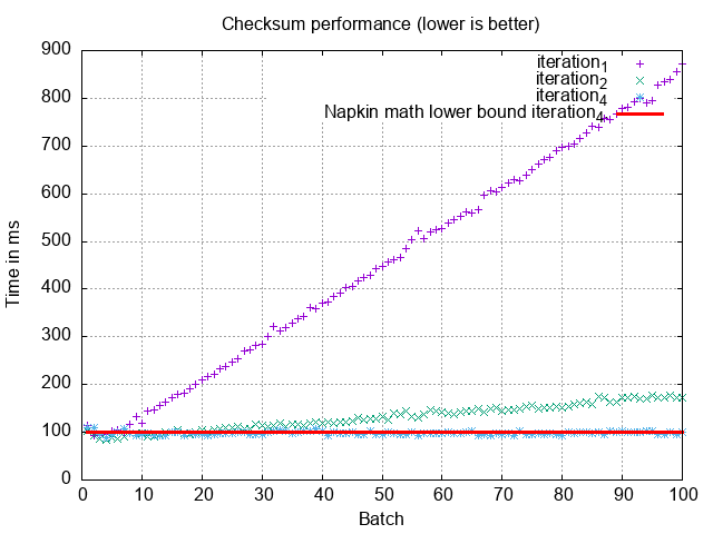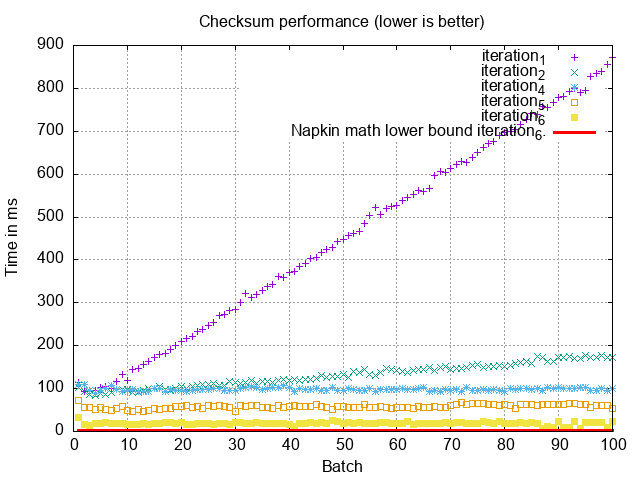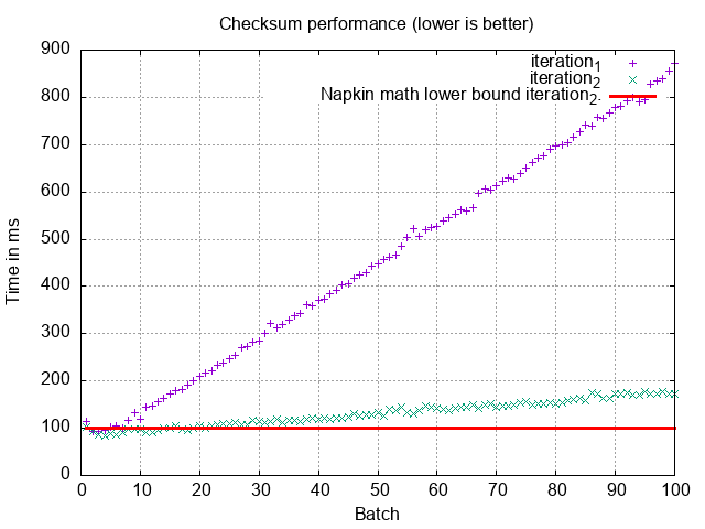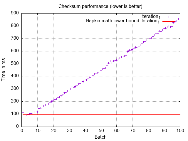 What’s going on? We were expecting single-digit milliseconds, but we’re seeing 20ms per batch! Something is wrong. 20ms per batch still means our total checksumming time is 3 min. We’ve got more work to do.