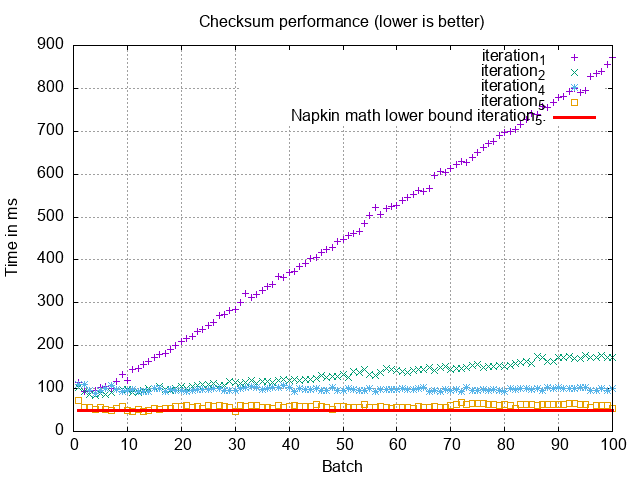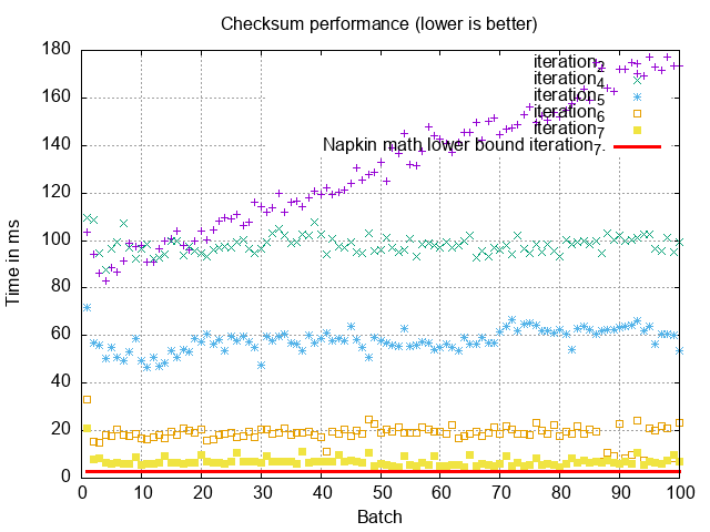 5ms per batch is close to the theoretical floor we established in iteration 6! To checksum our full 100M records, this would take 50 seconds. We aren’t going to get much better than this as far as I can tell without modifying MySQL or pre-computing the checksums with e.g. triggers.