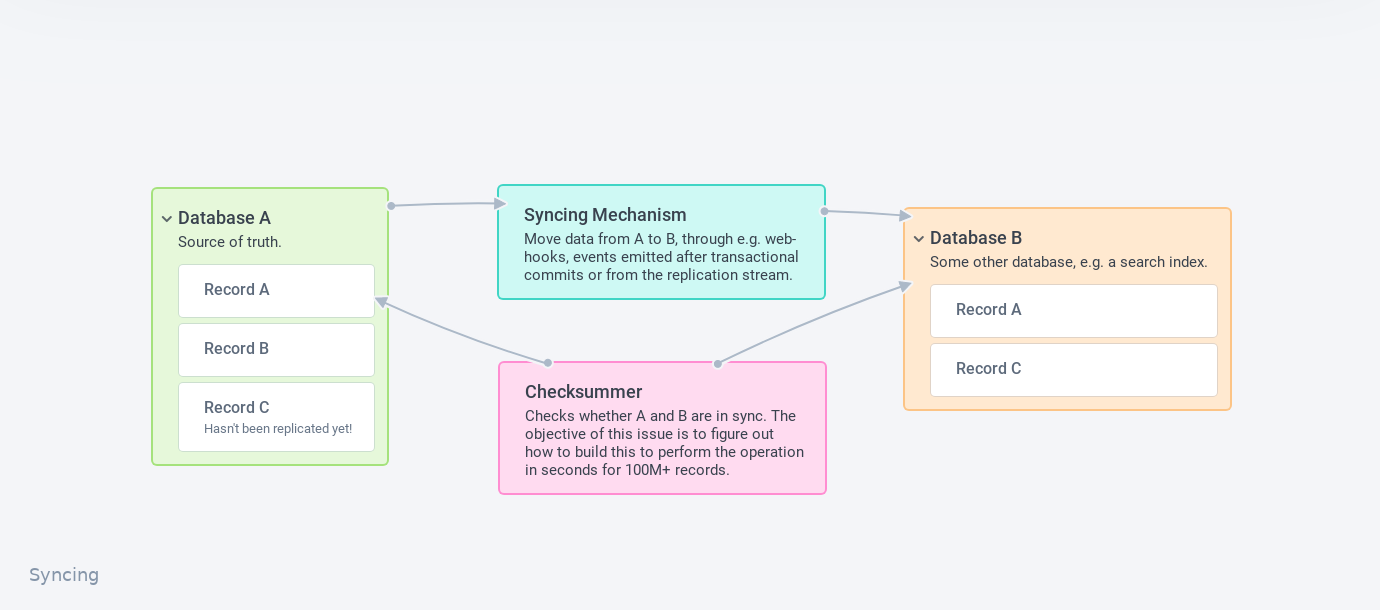 But even if you’re doing something that’s theoretically bullet-proof, like using the database replication logs through Debezium, there’s still a good chance a bug somewhere in your syncing pipeline is causing you to lose occasional events. If theoretical guarantees were adequate, Jepsen wouldn’t uncover much, would it? A team I worked with even wrote a TLA+ proof, but still found bugs with a solution like the one I describe here! In my experience, a checksumming system should be part of any syncing system.