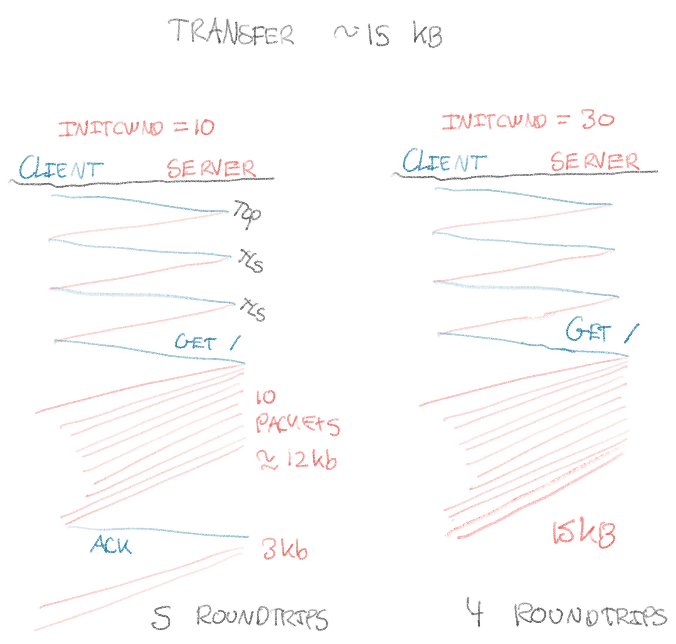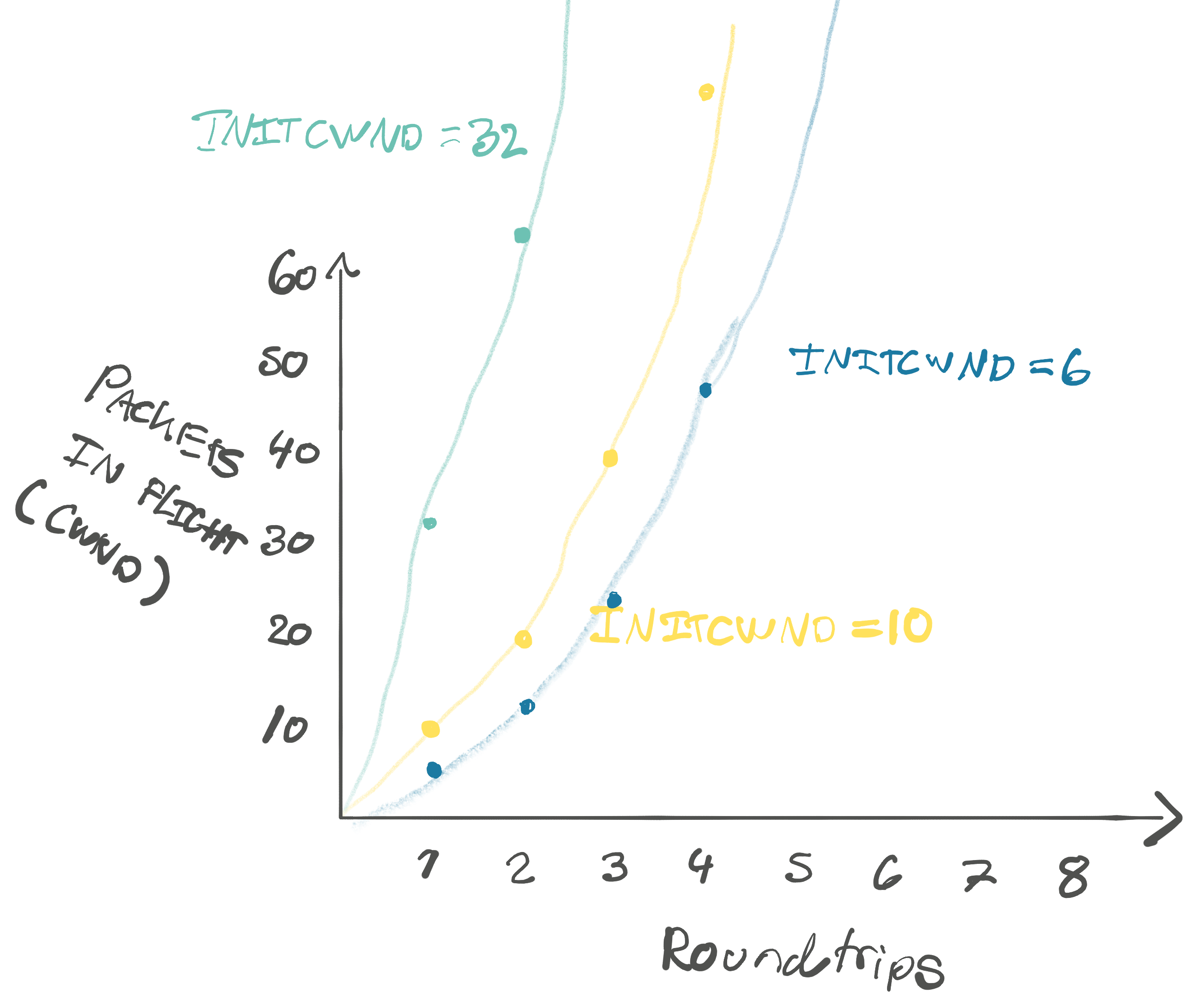 As we saw in the intro, it’s common among CDNs to raise the values from the default to e.g. 32 (~46kb). This makes sense, as you might be transmitting images of many megabytes. Waiting for TCP slow start to get to this point can take a few roundtrips.