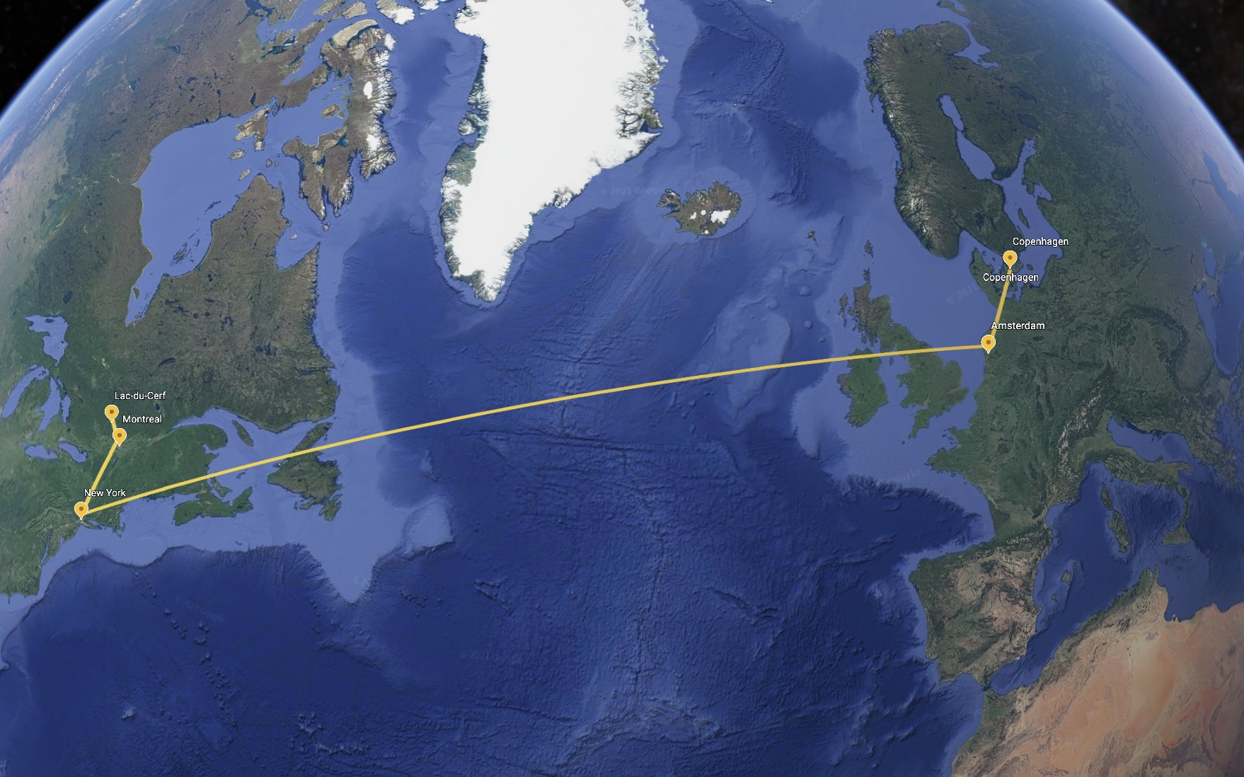 Copenhagen through the path Montreal -> New York -> Amsterdam -> Copenhagen.