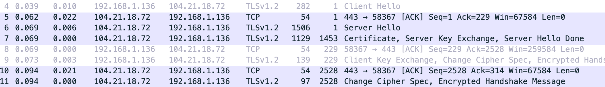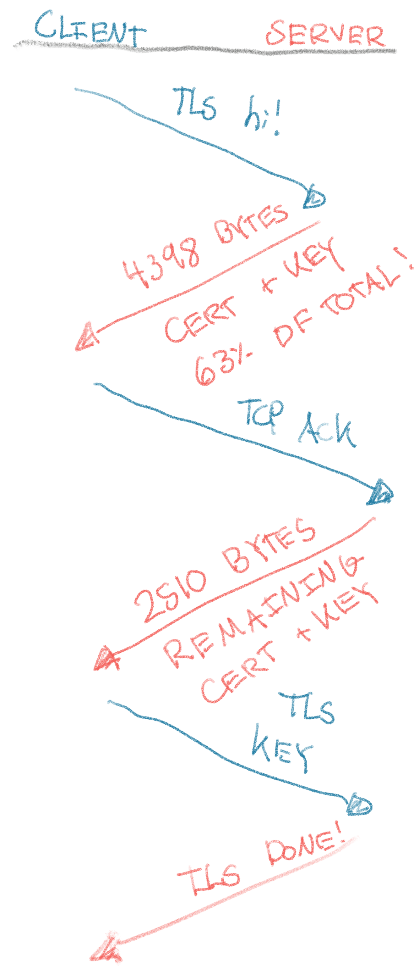 Put another way, the server’s TCP implementation has decided it’s not confident the poor client can receive that many tasty bytes all at once yet – so it sends a petty 4398 bytes of the certificate. Of course, 63% of a certificate isn’t enough to move on with the TLS handshake… so the client sighs, sends a TCP ACK back to the server, which then sends the meager 2510 left of the certificate so the client can move on to perform its part of the TLS handshake.