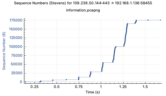 I’m not entirely sure why it follows a cubic function. I expected TCP slow start to just double every roundtrip. 🤷 As far as I can gather, on modern TCP implementation the congestion window is doubled every roundtrip until a packet is lost (as is the case for most other sites I’ve analyzed, e.g. the session in the screenshot below). After that we might move to a cubic growth. This might’ve changed later on? It’s completely up to the TCP implementation.