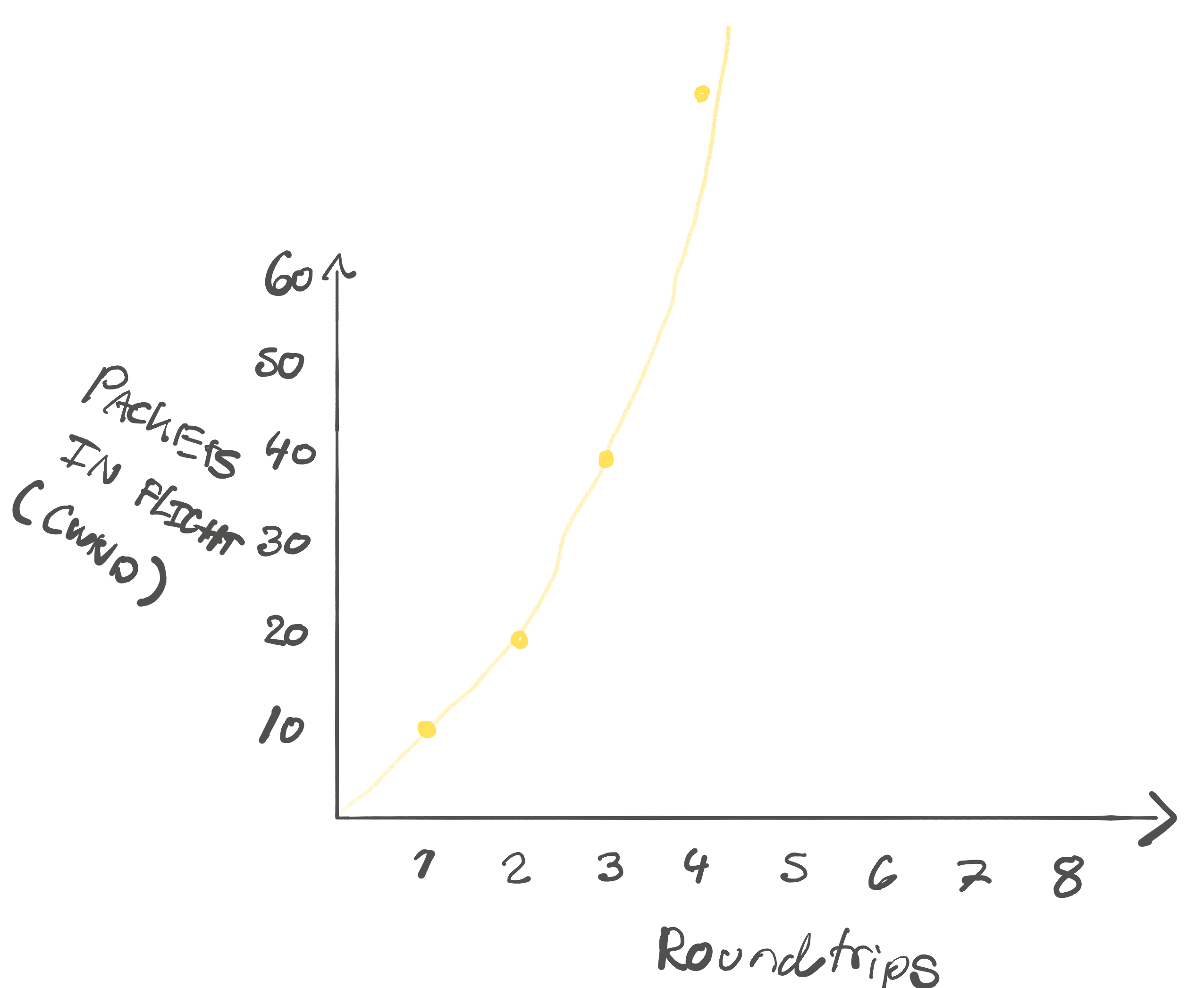 Typically, the server will continue to double the number of packets (~1460 bytes each) for each successful roundtrip until either an unsuccessful roundtrip happens (slow or dropped packets), or the bytes in flight would exceed the client’s receive window.