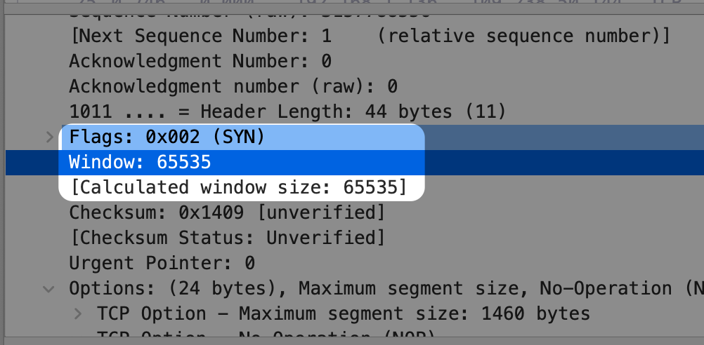 When a TCP session starts, the client will advertise how many bytes it allows in flight. This typically is much larger than the server is wiling to send off the bat. We can pull this up in the initial SYN package from the client and see that it’s ~65kb: