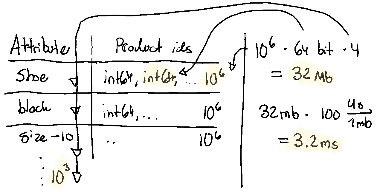 We have 4 bitmaps (one per condition) of 10^6 product ids, each of 64 bits. That’s 4 * 10^6 * 64 bits = 32 Mb. Would this be in memory or on SSDs? Well, let’s assume the largest merchants have 10^6 products and 10^3 attributes, that means a total of 10^6 * 10^3 * 64 bits = 8Gb. That’d cost us about $8 in memory, or about $1 to store on disk. In terms of performance, this is nicely sequential access. For memory, 32 mb * 100us/mb = 3.2 ms. For SSD (about 10x cheaper, and 10x slower than memory), 320 ms. 300 ms is way too high, but 3 ms is acceptable. $8 is not crazy, given that this would be the absolute largest merchant we have. If cost becomes an issue, we could likely employ good caching since 300 ms is too high for steady-state, but not for the occasional cache-miss.