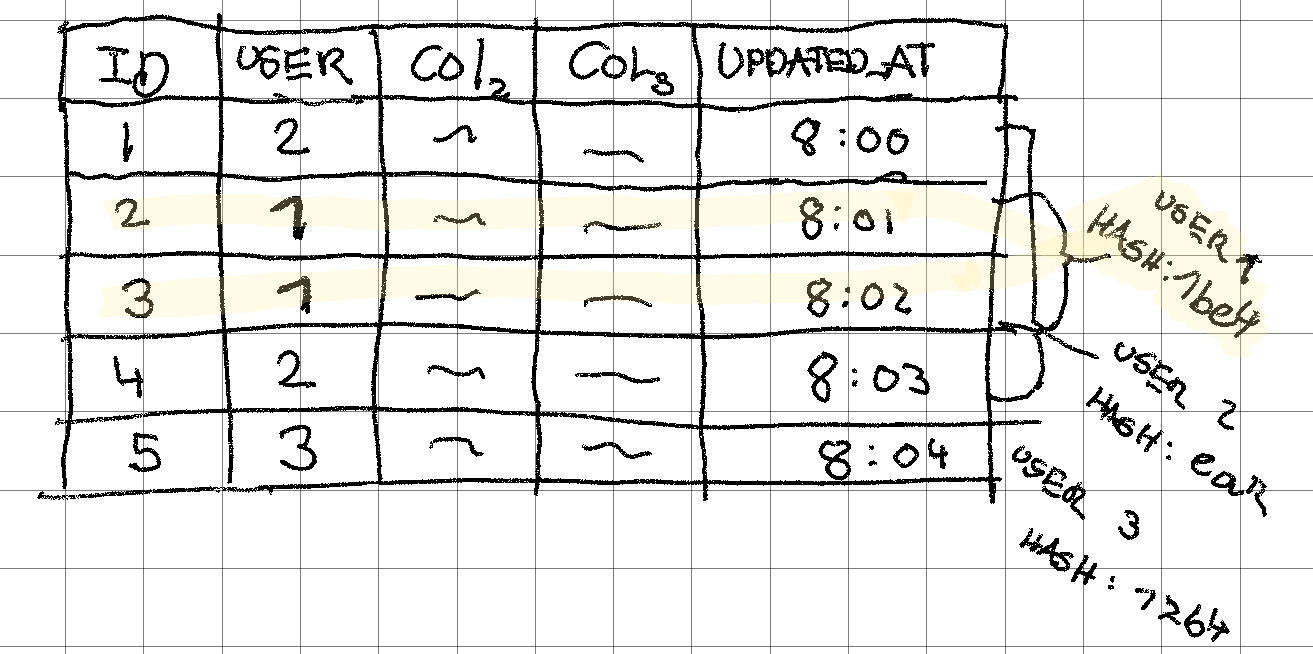 We’ll imagine a slightly different scenario. We have a client (web browser with local storage, or mobile) with state stored locally from table. They’ve been lucky enough to be offline for a few hours, and is now coming back online. They’re issuing a sync to get the newest data. This client has offline-capabilities, so our user was able to use the client while on their offline journey. For simplicity, we imagine they haven’t made any changes locally.